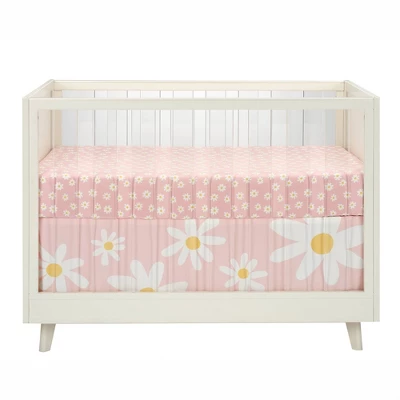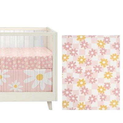 Your little one will love falling asleep in a field of sweet daisies. The Daisy Dreams three-piece crib bedding set includes one soft and cozy fleece blanket, one breathable 100% cotton fitted crib sheet, and one decorative crib skirt. The ultra-soft fleece blanket is on a petal pink and white checkered ground with rose pink and sun-kissed yellow daisies. The breathable, 100% cotton fitted crib sheet is on a rose-colored ground with sweet white daisies. There is elastic all the way around ensuring a safe and secure fit on a standard size crib mattress measuring 28” X 52”. The crib skirt, on a petal pink ground with various size daisies, has a 14 ½” drop. The crib skirt is a great way to add the finishing touch to your child’s crib.