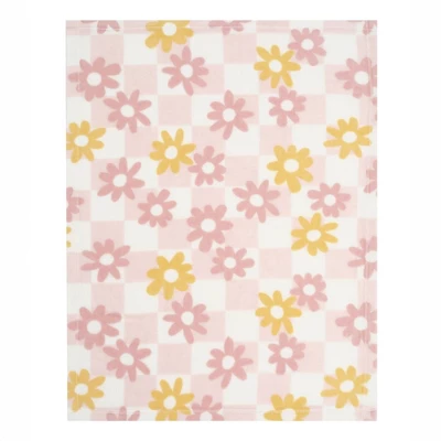 - Luxurious soft fleece blanket is on a petal pink and white checkered ground with rose pink and yellow daisies.