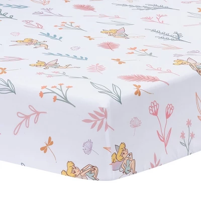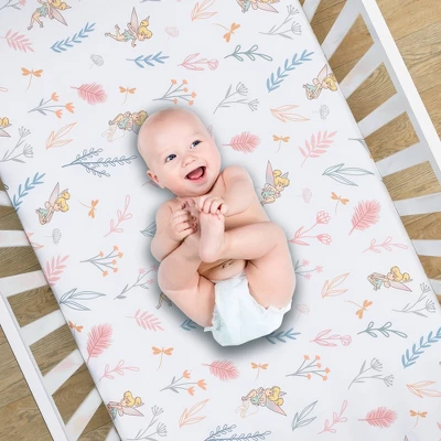 This amazing Disney Baby Tinker Bell crib bedding set includes one quilt, one fitted crib sheet, and one decorative crib skirt. Colors transition from pretty pinks to gorgeous lavenders. The quilt features Tinker Bell in some of her favorite poses along with flowers, leaves, dragonflies, mushrooms, and stars. The fitted crib sheet and back of the quilt is a multi-colored print on a soft white ground. The fitted crib sheet has elastic all the way around ensuring a safe and secure fit on a standard size crib mattress measuring 28” X 52”. The decorative crib skirt features Tinker Bell with colorful flowers and leaves and has a 10” drop. This bedding set is made in a soft microfiber material that is gentle on baby’s delicate skin.