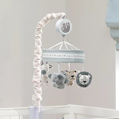 Four soft plush jungle animals decorate this charming musical mobile. There is one elephant, one tiger, one giraffe, and one lion. They all have embroidered faces and are made of a soft, fuzzy velour. They rotate underneath a taupe ring adorned with a geometric print twill tape. The scrunchie which covers the mobile arm is a creamy white velour. The music box has a sticker of our friendly sloth Speedy. The musical mobile rotates to nursery songs for 20 minutes, has an on/off switch and volume control. It plays Brahms Lullaby, Twinkle, Twinkle Little Star and Rock-a-Bye Baby. Requires 3 AAA batteries, not included.