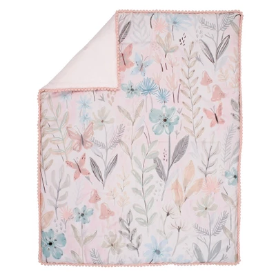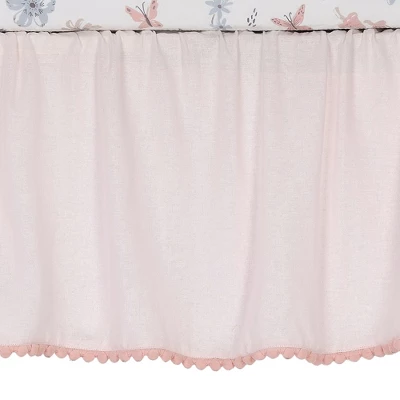 Your little one will drift off to dreamland surrounded by this lovely watercolor floral nursery bedding collection. The three-piece baby bedding crib set includes one quilt, one breathable 100% cotton fitted crib sheet, and one crib skirt. Designed in soft shades of robin egg blue, blush, light pink, warm taupe, and soft gray on a light cream-colored ground. The quilt and crib skirt have a pretty pink pom pom trim. The breathable 100% cotton fitted crib sheet features pretty butterflies, spring flowers, mushrooms, and leaves. The fitted crib sheet has elastic all the way around ensuring a safe and secure fit on a standard sized crib mattress measuring 28” X 52”. The crib skirt adds the finishing touch to your child’s crib. It is made in pink linen viscose and is 14 ½” long. It has split corners for easy placement. All items are machine washable for easy care.