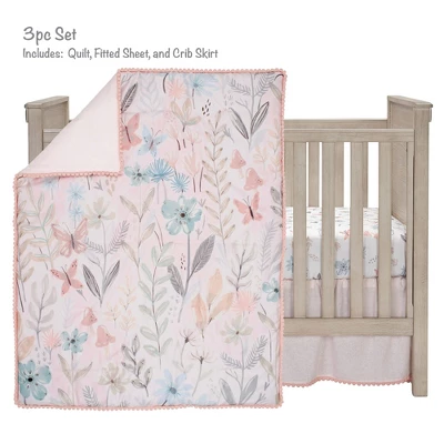 - 3-piece crib bedding set includes one quilt, one breathable 100% cotton fitted crib sheet, and one crib skirt