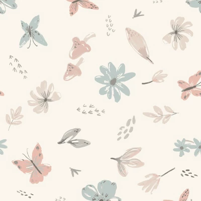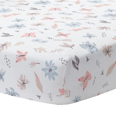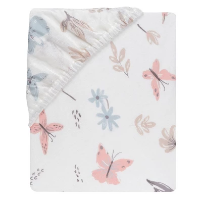 This 100% cotton fitted crib sheet features delicate butterflies, pretty spring flowers, cute little mushrooms, and leaves in pretty pastel colors on a light cream ground. There is elastic all the way around ensuring a safe and secure fit on a standard size mattress measuring 28” X 52”. Machine washable and dryable for easy care.