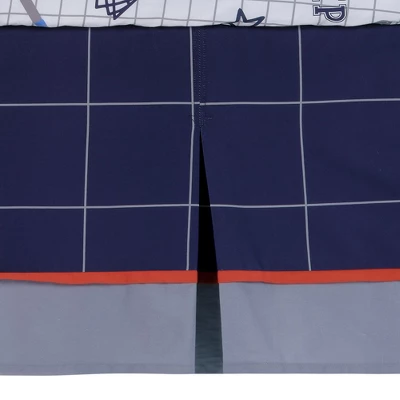 Your little one will sleep like an all-star with this custom designed sports theme crib bedding set. The three-piece set includes one quilt, one breathable 100% cotton fitted crib sheet, and one crib skirt. The patchwork style quilt, which is completely appliqued and embroidered, includes textured fabrications of heather gray chambray, velour, and faux suede. Featured sports include basketball, football, baseball, hockey, and soccer. The back of the quilt is a navy and gray windowpane pattern. The breathable 100% cotton fitted crib sheet includes all sports along with colorful stars. It has elastic all the way around ensuring a safe and secure fit on a standard-sized crib mattress measuring 28” X 52.” The crib skirt adds the finishing touch to your child’s crib. It is a cotton poly blend and has two front pleats. The upper panel is a navy and gray windowpane, and the lower panel is solid gray with a rust color trim in between. The four-sided crib skirt has a 14 ½” drop.
