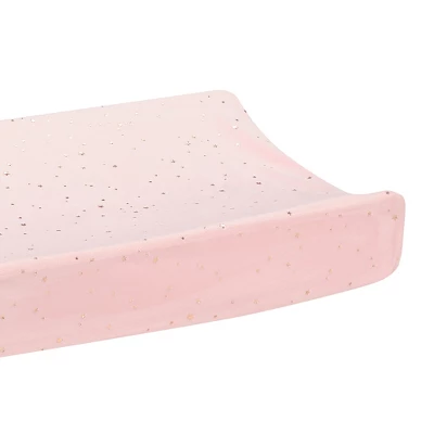 This is the perfect way to keep your little one’s changing area soft and stylish. The changing pad cover is pink minky with sparkling stars. It has elastic on the two short sides in order to fit securely on most standard size changing pads. There are buttonholes for the changing pad straps so your little one is safe and secure while getting their diaper changed.