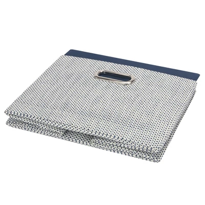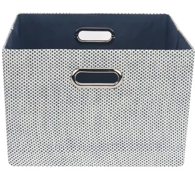 This sturdy storage basket is the perfect addition to your child’s nursery or playroom. It is made of blue and white cross weaved straws and has a nice blue polyester lining inside. There are two silver handles on the sides for carrying. It easily folds up for compact storage when not being used. It is sized at approximately 12 1/2” X 11” X 9”. Spot clean only