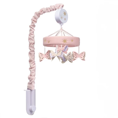 Five delicately crafted colorful butterflies flutter playfully around a soft pink ring adorned with eleven gold embroidered stars. The butterflies are layered in die-cut felt. The musical mobile plays nursery songs for 20 minutes, has an on/off switch and volume control. It plays Brahms Lullaby, Twinkle, Twinkle Little Star, and Rock-a-By-Baby. The scrunchie, which covers the mobile arm, is pink velour and there is a sticker with three gold starbursts on the music box. Requires 3 AAA batteries not included.