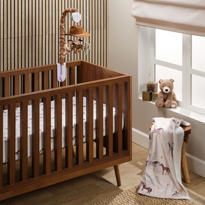 This unique western themed musical crib mobile features a brown felt cowboy hat with white cotton rope trim. There are four plush that circle slowly around. Two are plush velour horses, one is a sage color cactus, and one is a taupe color suede cowboy boot. This battery operated musical mobile plays nursery songs for 20 minutes, has an on/off switch, and volume control. It plays Brahms Lullaby, Twinkle, Twinkle Little Star, and Rock-a-By-Baby. Requires 3 AAA batteries not included.