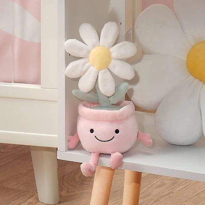 This cute Daisy Dreams plush flower pot has a happy face and is made with two shades of pink velour. It is approximately 11” tall and has a pretty white velour daisy with a green poseable stem and two leaves. The white daisy has eight velour petals. This adorable smiling face flower pot makes a super cute baby shower gift or welcome home baby gift.