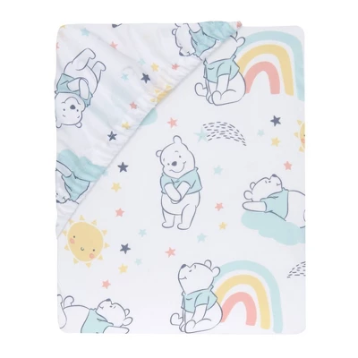 This Winnie the Pooh fitted crib sheet is made in a soft microfiber material on a white ground. It features Pooh in some of his cutest positions. He sits at the end of a rainbow, lays on top of a blue cloud, and stands shyly with his hands crossed and his head tilted. He is surrounded by colorful stars, happy suns with pink cheeks, and shooting stars. There is elastic all the way around ensuring a safe and secure fit on a standard sized crib mattress measuring 28” X 52”. It is machine washable for easy care.