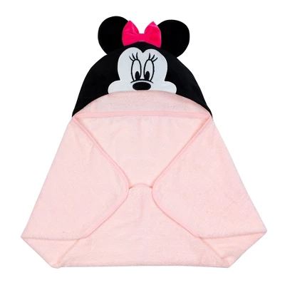 Your infant will love being wrapped in this soft and cozy Minnie Mouse hooded towel. The hood is velour and is lined in cotton terrycloth. The pure cotton terry towel is absorbent, and the binding is a dyed to match cotton jersey. The pink hooded towel is 34” wide X 23” high and is recommended for babies up to 30 pounds. Black and white velour was used for Minnie with embroidered black satin threads for her eyes and eyelashes. Of course, she is wearing her favorite fuchsia color bow. This makes a great baby shower gift or welcome home baby gift.
