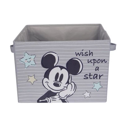 Mickey Mouse is the longtime mascot of The Walt Disney Company. This officially licensed Mickey Mouse foldable storage is sturdy and durable. It features Mickey on a gray background with white and blue lines. He is 7 ¼” tall and drawn in a dark gray and white sketchy style. The words “wish upon a star” are printed along with four stars that are blue, white, and creamy yellow. There are two side handles for easy carrying. The storage container is 12 ½” X 11” X 9”.