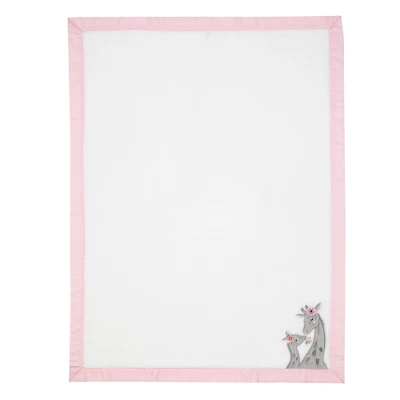 This luxurious soft white coral fleece blanket has a pink sateen border. Sweet mommy and baby giraffes are appliqued on the lower right side. The applique is 7 ½” high and 5” wide. Their bodies are made in a light gray fuzzy minky and their spots, mane, face, and flowers are embroidered. This blanket is 30” X 40” and will cuddle your little one in pure luxury.