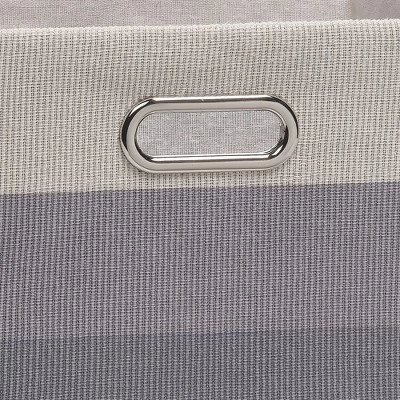 These sturdy ombre storage baskets are the perfect addition to your stylish nursery, playroom, kids’ room, and even your office. They are made in a cross-weave textured cotton, poly, rayon fabric with a poly cotton rayon lining. There are two built in silver metal handles for easy carrying. The baskets are 12 ½” X 11” X 9”. The color sequence is natural cream at the top, light gray in the middle and medium gray at the bottom. Spot clean only.