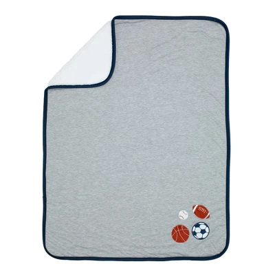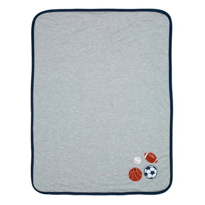 A basketball, football, baseball, and soccer ball are appliqued on this soft heather gray jersey baby blanket. The front is a cotton-blend jersey with a soft faux shearling back and navy trim. It is 30” X 40” and makes a great stroller blanket, cuddling with your little one blanket or just running errands blanket. It is a top baby registry pick and perfect as a baby shower gift or welcome home baby gift.
