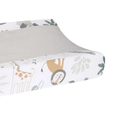 A soft gray minky center is perfect for changing your little one. The elastic side panels are 100 percent cotton and is an adorable jungle print with lions, elephants, birds, palm trees, and leaves. The center panel is a soft and cozy polyester minky. There are buttonholes for the changing pad straps so your little one is safe and secure while getting their diaper changed. Machine washable and dryable for easy care.