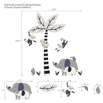 A great way to add a feature wall to your child’s room is with these custom wall decals. There are five sheets that are 12” X 18” each with a total of 15 die-cut pieces. Featured are mommy and baby elephants, two monkeys, one sloth, one toucan and a large black and white tree. The finished size is approximately 43” x 48” when applied as shown. Works best on smooth walls.