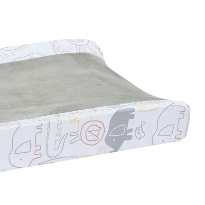 This soft gray minky velour center feels gentle on your baby’s delicate skin. The side panels are cotton and our adorable jungle pattern with gray elephants and lions, giraffes and alligators are in silhouette. Elastic on the two short sides fits snugly around your changing pad ensuring it stays in place. There are button holes for the changing pad straps so your little one is safe and secure while getting their diaper changed. Machine washable for easy care.