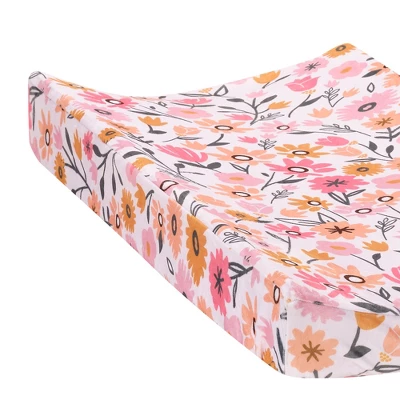 This ultra soft minky changing pad cover is decorated with pretty pastel colored flowers on a soft pink ground. There is elastic on the two short sides ensuring a snug fit on a standard size changing pad. There are buttonholes for the safety straps so your little one is safe and secure while getting their diaper changed.