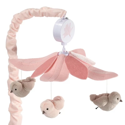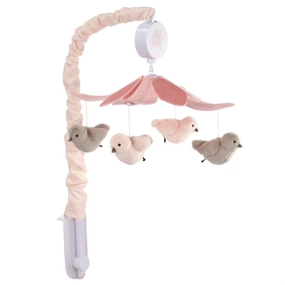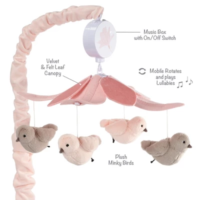 - Two adorable pink minky birds and two sweet gray minky birds rotate slowly around this musical crib mobile