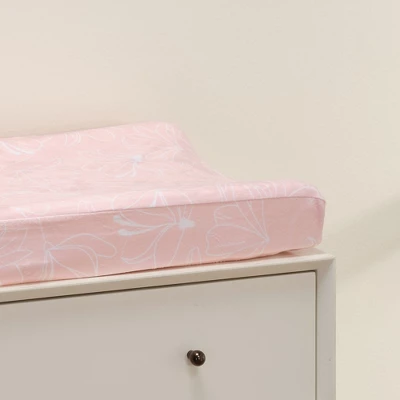 Your little one will be warm and comfy on this soft petal pink minky changing pad cover with white outlined flowers. Elastic on the two short sides ensure a secure fit on most changing pads. There are buttonholes for the safety straps so your child is safe and secure while getting their diaper changed. Machine washable for easy care.