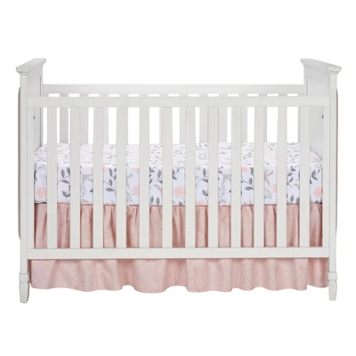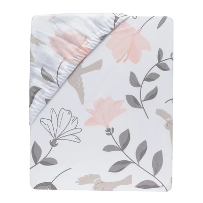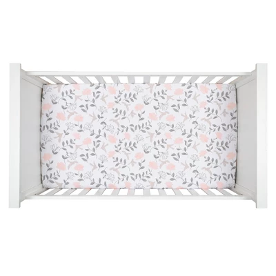 The breathable 100% cotton fitted crib sheet is on a white ground with elegant gray leaves, soft petal pink flowers and sweet open winged birds. There is elastic all the way around ensuring a safe and secure fit on a standard size crib mattress measuring approximately 28 inches by 52 inches. It is machine washable for easy care.