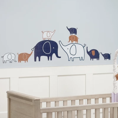 A great way to add a feature wall to your child’s room is with these custom wall decals. There are four sheets that are 12” X 18” with pre-cut elephants in indigo blue, caramel, and white. Some are filled with color and some are in silhouette. Finished size as shown is approximately 19” X 73”. These decals work best on smooth walls.
