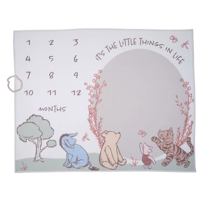 Celebrate each month of your baby’s 1st year with our Classic Pooh Bear and Pals Milestone Baby Blanket. Made in a super soft white polar fleece fabric featuring Winnie the Pooh, Piglet, Tigger, and Eeyore along with a tree, plants, and the words “It’s the Little Things in Life.” Place the honey pot shaped felt marker on the month of your baby’s age for a camera-ready moment. Generously sized at 50 inches by 40 inches, providing ample space for playtime, tummy time, and of course, that perfect social media photo.