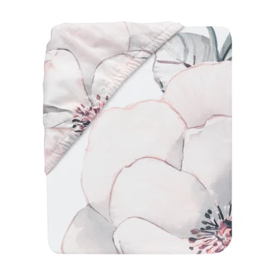 This beautiful reversible floral themed baby bedding nursery set comes complete with a quilt, 100% cotton fitted crib sheet, pom pom trimmed crib skirt and a complete set of wall decals. These gorgeous blossoming flowers are in shades of soft pink with gray accents. It looks like an exquisite watercolor painting and has a border of a linen rayon blend. Pretty pink pom poms decorate the entire quilt and the reverse side is a gray ground with all the pretty coordinating flowers. The 100% cotton fitted crib sheet matches back to the front of this lovely quilt. A 16” long crib skirt in a lovely shade of pink linen and rayon includes the pom pom trim and finishes off the crib in complete luxury. Add to that a set of beautifully toned large wall decals which add a designer touch to the nursery. Please note: set includes one set of wall decals which contains 7 flowers and 2 bunches of leaves; nursery photo is shown with more than one set of wall decals as additional sets are available separately.