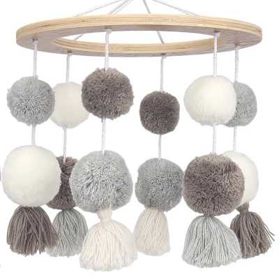 Soft furry pom-poms decorate this charming musical mobile. It has six strings of multiple pom-poms with tassel like trim in earth tone colors which is perfect for boys and girls. The scrunchie which covers the mobile arm is in white velour. This battery operated musical mobile plays nursery songs for 20 minutes, has an on/off switch and volume control. It plays Brahms Lullaby, Twinkle-Twinkle Little Star and Rock-a-Bye Baby. Requires 3 AAA batteries not included.