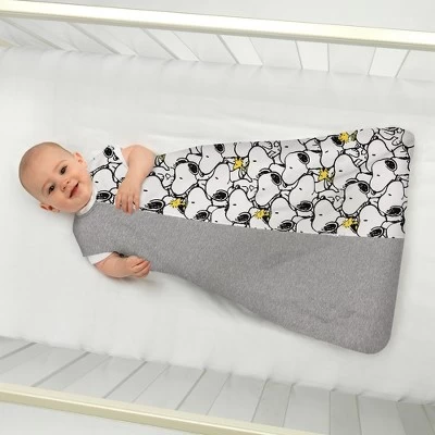 Keep your little one warm, cozy, and stylish in this adorable Snoopy and Woodstock breathable cotton jersey wearable blanket. This comfy sleepsack is more than a blanket; it is a wearable hug that lets your baby move and explore while staying perfectly cozy. Made in 100% cotton jersey, it is soft and breathable and is delicate on baby’s sensitive skin. The right side features multiple Snoopys in a trendy sketch style with little yellow Woodstocks adding to the charm. The left side and back is a heather gray cotton jersey and the 20” long zipper is concealed by a placket.