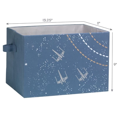 Stay on target with these X-Wing fighters in the Star Wars Galaxy. This officially licensed Star Wars galaxy collapsible storage is the perfect place to store all your toys, clothes, books, gear, etc. This foldable/collapsible canvas storage has a gray polyester lining and blue side handles for easy carrying. The sturdy outer shell is dusty blue canvas printed with a galaxy print with X-Wings on the front. Sized at 12 1/2” X 11” X 9” making this a great addition for all Star Wars fans.