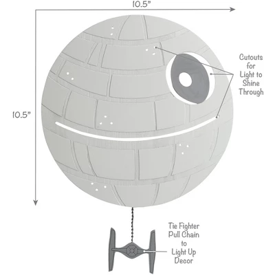 Every Star Wars fan is sure to love this light-up Death Star wall decor, as the Death Star is a cultural icon. It is back lit with an LED light which requires 3 AAA batteries, not included. There are multiple light emitting openings that add interest and dimension to this amazing light up wall decor. At the bottom a Tie Fighter hangs from a metal chain to power this space station on or off. This is an awesome gift to welcome home your little padawan (Jedi in training) and is a top baby registry pick as well.