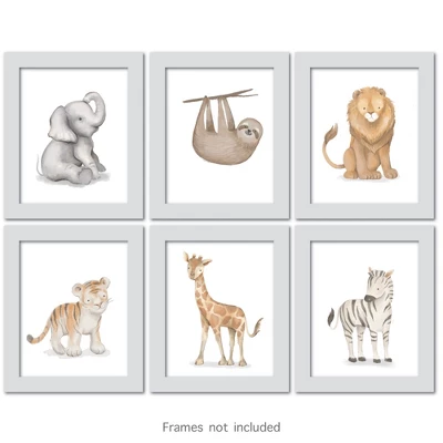 Our Lambs & Ivy artist designed these six custom watercolor prints. These prints are a great way to decorate a feature wall in your child’s room. They are professionally printed on 300 gram matte card stock and are perfectly sized at 8” X 10” each to create a stunning decor when hung on a wall together. Each print features a different jungle animal. There is a sitting lion, a gray baby elephant, a standing giraffe who is 7” tall, a taupe color sloth who loves hanging upside down, a cute stripy zebra and a sweet baby tiger. You can frame them or stick them up directly on the wall (frames and sticky dots not included).